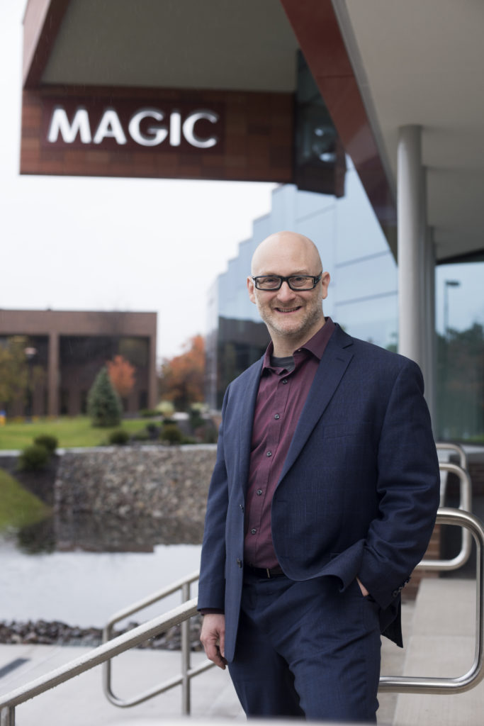 Eric Berlatsky smiles at the camera with short brown hair and is wearing a green and white striped polo.