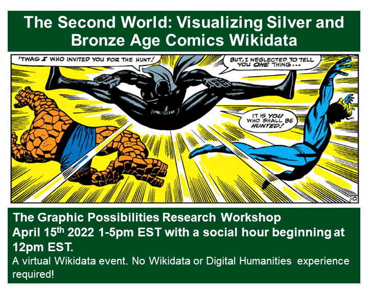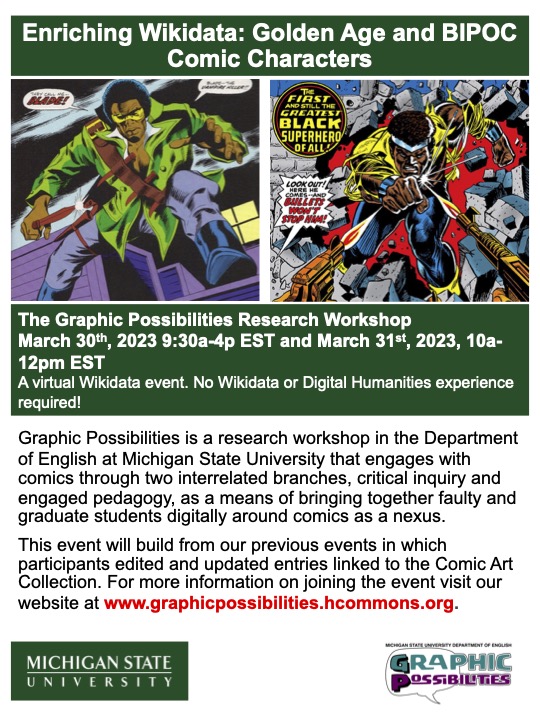 Working in conjunction with Department of English, Graphic Possibilities Research Workshop, and the Consortium for Critical Diversity in Digital Age Research (CEDAR), this Wikidata event seeks to address gaps in digital record with an emphasis on Golden Age comics with BIPOC characters and by BIPOC creators. We welcome participants of all Digital Humanities/Wikidata experience to join our community of students, specialists, staff, faculty, and comics / Wikidata fans!